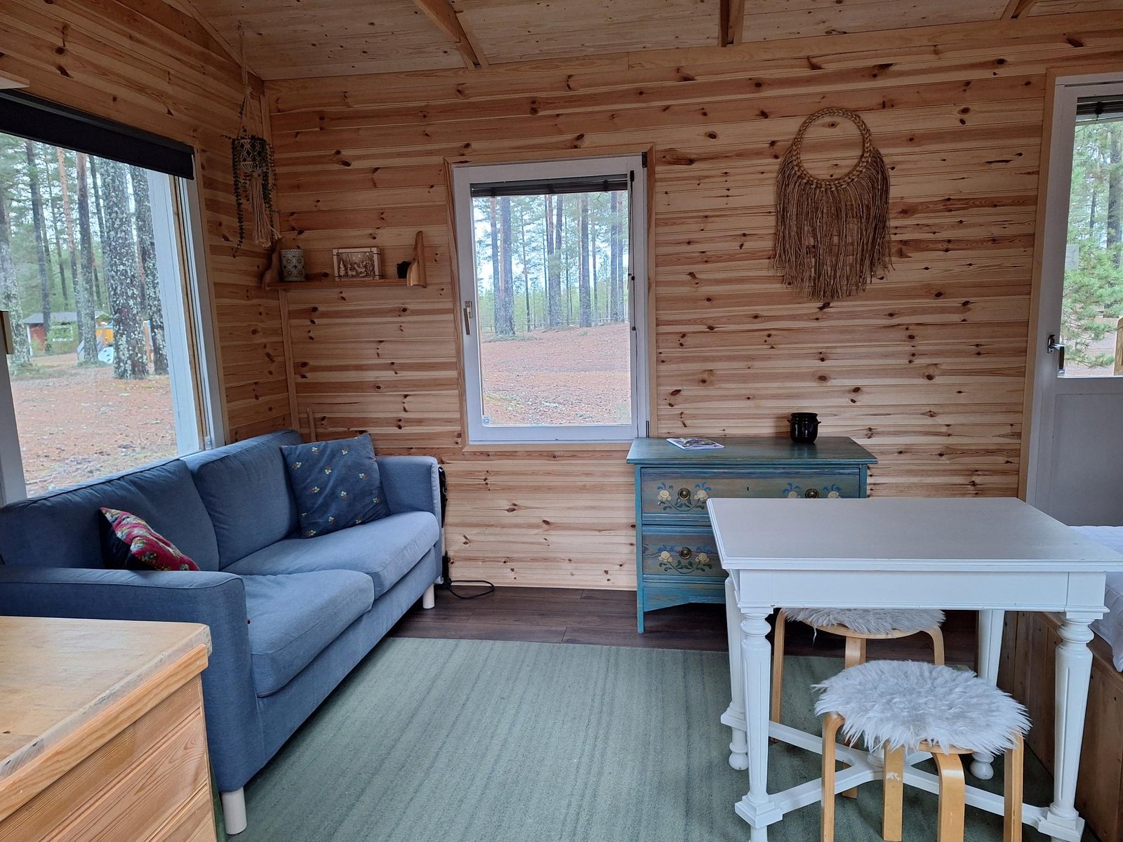 Er staat een heerlijk 2 persoonsbed in deze stuga en hij heeft een fijn terras om te genieten van het buitenleven. Je hebt een prachtig uitzicht op het bos, wandel vanaf je stuga de Zweedse bossen in. Er is een keukentje met koud water en een mini living.